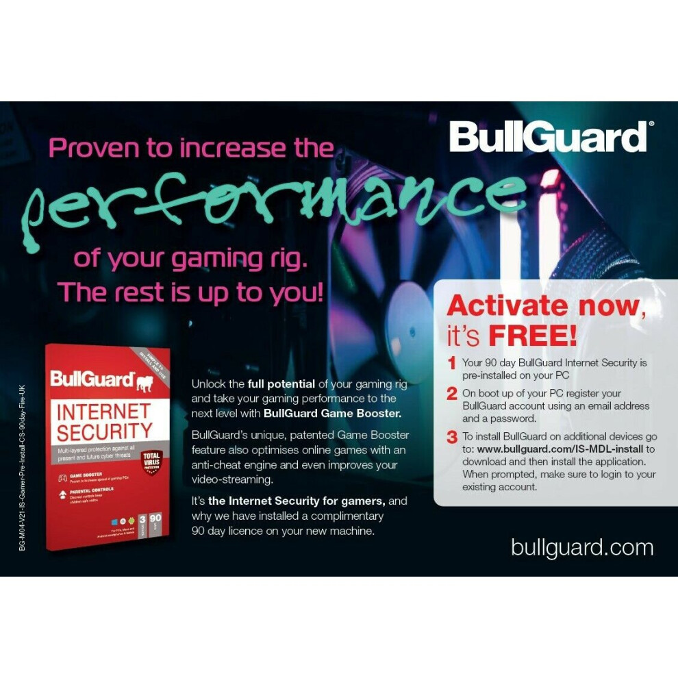 BullGuard Anti-Virus Premium internet security with Game Booster - BullGuard Internet Security delivers complete protection for your devices. BullGuard's Game Booster optimizes online games with an anti-cheat engine and even improves your video-streaming. It's the Internet Security for the gamers, and why we have installed a complimentary 90 day license on your new machine.